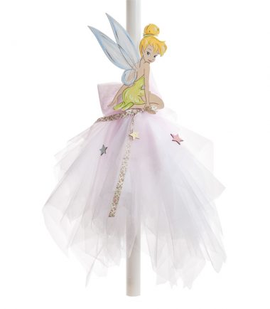 Disney λαμπάδα βάπτισης πλούσια με τούλι και φιόγκο από ροζ οργάντζα, διακοσμημένη με ξύλινη φιγούρα της Tinkerbell,κορδέλα floral και ξύλινα αστεράκια