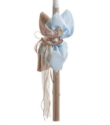 Ύψος: 90 cm Λαμπάδα βάπτισης τυλιγμένη με λινάτσα σε φυσικό χρώμα,στολισμένη με λινάτσα και γάζα σιέλ δεμένα με κορδέλες εκρού-καφέ και διακοσμημένη με ξύλινο καρουζέλ σε καφέ-σιέλ χρώμα