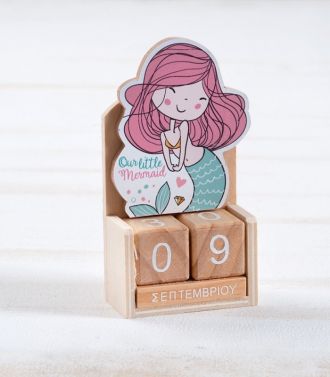 Ξύλινο natural ημερολόγιο με δυνατότητα αλλαγής της ημερομηνίας προσαρμόζοντας τα κυβάκια. Είναι διακοσμημένο με ξύλινη παράσταση γοργόνα σε αποχρώσεις του ροζ. Ημερολόγιο: 6.1 x 3.1 x 4cm Κοπτικό: 9 x 11cm Συν.ύψος: 15cm