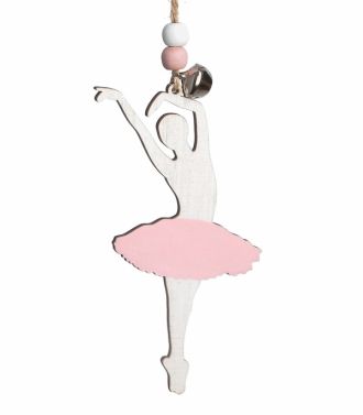 Διάστ.: 5,7×0,5×11,5cm. Συν. Ύψος: 22cm Ξύλινη κρεμαστή μπαλαρίνα σε λευκό χρώμα και ροζ φούστα, διακοσμημένη με χάντρες και μεταλλικό κουδουνάκι. Ιδανικό για διακόσμηση. Ελάχιστη ποσότητα 24 τμχ