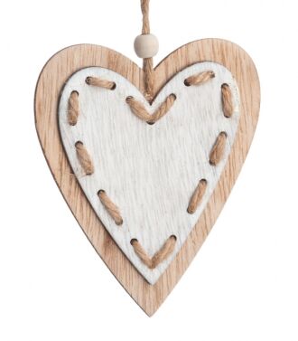 Ξύλινη κρεμαστή διακοσμητική διπλή καρδιά με χρώματα natural-λευκό και περαστό κορδόνι natural περιμετρικά. Διακοσμημένη με ξύλινη χάντρα. Καρδιά: 9×0,4x11cm Συν. Ύψος: 18cm Ελάχιστη ποσότητα 24 τμχ.