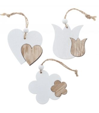 Ξύλινα κρεμαστά διακοσμητικά σε λευκό με natural χρώμα . Διατίθενται σε ξύλινη συσκευασία των 9τμχ και αποτελείται από 3 διαφορετικά σχέδια , καρδιά-τουλίπα-μαργαρίτα. Είναι κατάλληλα για διακοσμήσεις και κατασκευές Μαργαρίτα:5.5×0.4×5.5x12cm(συν.ύψος) Μικρή μαργαρίτα διάμετρος 2.5cm Συνολ.μήκος: 6cm Καρδιά:5.9×0.4x6x12cm(συν.ύψος) Mικρή καρδιά: 3.5×3.5cm Συνολ.μήκος:6.2cm Τουλίπα:5.2×0.4×5.8x13cm(με το σχοινάκι) Μικρό νούφαρο: 2.7x3cm Συνολ.μήκος:6cm Kουτί: