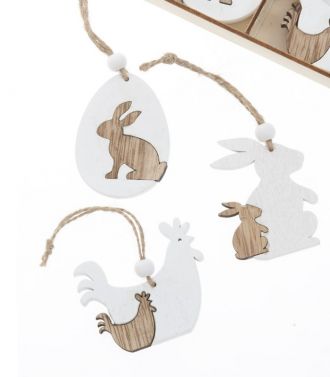 Ξύλινα κρεμαστά διακοσμητικά σε λευκό με natural χρώμα . Διατίθενται σε ξύλινη συσκευασία των 9τμχ και αποτελείται από 3 διαφορετικά σχέδια , Λαγό μέσα σε ωοειδές σχήμα-κοτόπουλο-κουνέλι . Είναι κατάλληλα για διακοσμήσεις και κατασκευές Αυγό:4.5×0.4×6.1x12cm(συν.ύψος) Μικρός λαγός:3.5×3.8cm Κότα:6×0.4×5.4x10cm(συν.ύψος) Μικρή κότα:2.5×2.8cm Δίπλος λαγός:4.7×0.4×6.1x12cm(συν.ύψος) Mικρός λαγός:2×2.8cm Kουτί: 21x7x1.7cm