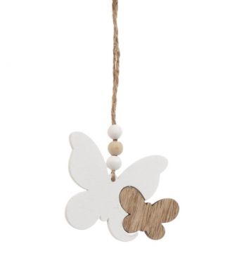 Ξύλινη κρεμαστή διπλή πεταλούδα σε χρώμα λευκό με natural, διακοσμημένη με λευκή χάντρα.Ιδανική για διακοσμήσεις και κατασκευές. Πεταλούδα μεγάλη: 6.5×0.4×5.7cm Πεταλούδα μικρή: 4×0.4×2.7cm Συν. Μήκος: 8cm Συν. Ύψος: 14cm