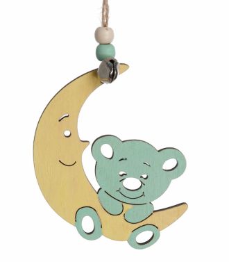 Ξύλινο κρεμαστό κίτρινο φεγγάρι με βεραμάν αρκουδάκι, διακοσμημένο με χάντρες και μεταλλικό κουδουνάκι. Ιδανικό για διακόσμηση. Διάστ.: 8,3×0,4×9,5cm Συν. Ύψος: 19cm