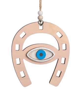 Ξύλινο κρεμαστό ρόδι σε natural χρώμα με μπλε στρογγυλό μάτι, διακοσμημένο με χάντρες και μεταλλικό κουδουνάκι. Ιδανικό για διακόσμηση. Διάστ.: 7,3 (διάμ.)x0,4×8,5cm Συν. Ύψος: 18cm Ελάχιστη ποσότητα 24 τμχ