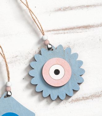 Ξύλινο κρεμαστό πέταλο σε natural χρώμα με μπλε μάτι, διακοσμημένο με χάντρες και μεταλλικό κουδουνάκι. Ιδανικό για διακόσμηση. Διάστ.: 8,7×0,4×9,5cm Συν. Ύψος: 19cm