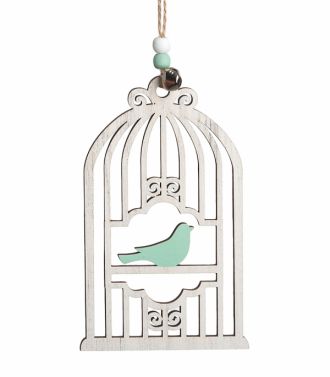 Διάστ.: 9,5×0,4×15,7cm Συν. Ύψος: 25,5cm Ξύλινο κρεμαστό κλουβί σε brush ivory με βεραμάν πουλάκι, διακοσμημένο με χάντρες και μεταλλικό κουδουνάκι. Ιδανικό για διακόσμηση.