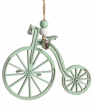 Διάστ.: 11×0,4x9cm Συν. Ύψος: 19cm Ξύλινο κρεμαστό ποδήλατο σε βεραμάν χρώμα, διακοσμημένο με χάντρες και μεταλλικό κουδουνάκι. Ιδανικό για διακόσμηση. Στη πίσω όψη μόνο βεραμάν.