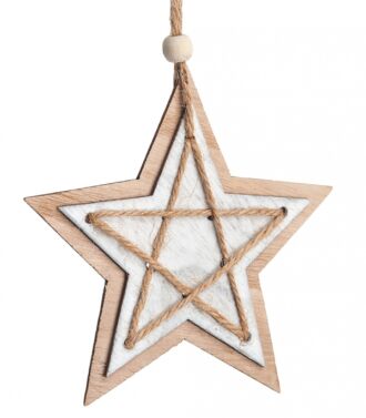 Ξύλινο κρεμαστό διακοσμητικό διπλό αστέρι με χρώματα natural-λευκό και περαστό κορδόνι natural περιμετρικά. Διακοσμημένο με λευκή χάντρα. Αστέρι: 11,5×0,4x11cm Συν. Ύψος: 18cm Ελάχιστη ποσότητα 24 τμχ.