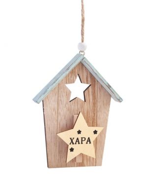 Ξύλινο κρεμαστό διακοσμητικό σπιτάκι με σιέλ σκεπή. Μπροστά είναι διακοσμημένο με κίτρινο αστέρι με μανταλάκι και την λέξη ”Χαρά”. Διάστ.: 9.5 x1.5 x12cm Συνολικό ύψος με σχοινί: 23cm