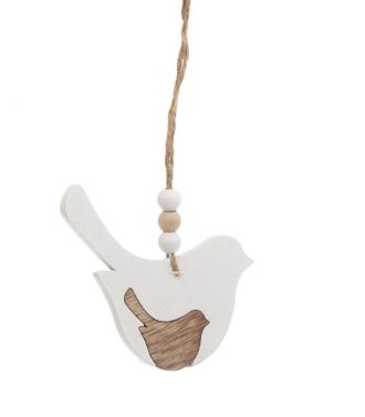 Ξύλινο κρεμαστό διπλό πουλάκι σε χρώμα λευκό με natural, διακοσμημένο με λευκή χάντρα.Ιδανικό για διακοσμήσεις και κατασκευές. Πουλάκι μεγάλο: 8.7×0.4×6.7cm Πουλάκι μικρό: 3.8×0.4x3cm Συν. ύψος: 15cm