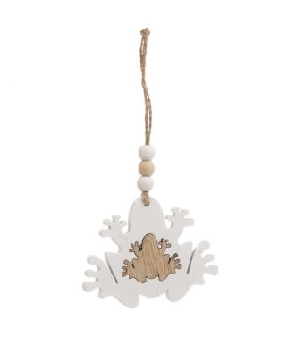 Ξύλινος κρεμαστός διπλός βάτραχος σε χρώμα λευκό με natural, διακοσμημένος με λευκή χάντρα.Ιδανικό για διακοσμήσεις και κατασκευές. Βάτραχος μεγάλος: 7.7×0.4x6cm Βάτραχος μικρός: 3.5×0.4×2.5cm Συν. Ύψος: 16cm
