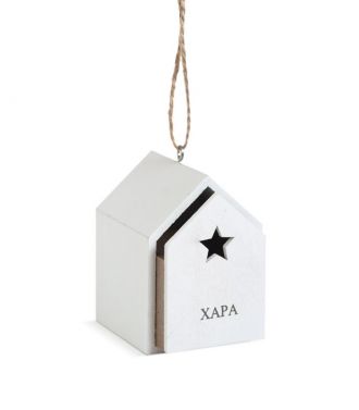 Ξύλινο κρεμαστό διακοσμητικό σπιτάκι σε λευκό χρώμα με natural συρταράκι και την λέξη “Χαρά”. Διάσταση: 5x5x7cm, Συνολικό ύψος:15cm