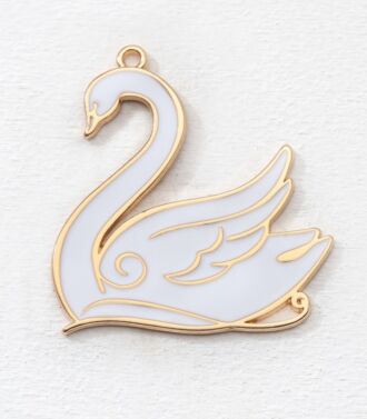 Μεταλλικός κρεμαστός διακοσμητικός κύκνος σε χρυσό χρώμα με σμάλτο λευκό. Κατάλληλο για διακοσμήσεις και χειροποίητες κατασκευές. Η συσκευασία περιέχει 10 τεμάχια. Η τιμή αφορά το τεμάχιο. Διάσταση: 5 x 0.15 x 5.3 cm Τρύπα 3mm