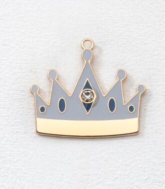 Μεταλλική κρεμαστή διακοσμητική κορώνα σε χρυσό χρώμα με σμάλτο γκρι-σιέλ και στρας. Κατάλληλο για διακοσμήσεις και χειροποίητες κατασκευές. Η συσκευασία περιέχει 10 τεμάχια. Διάσταση: 4.4 x 0.1 x 4 cm Τρύπα 3mm