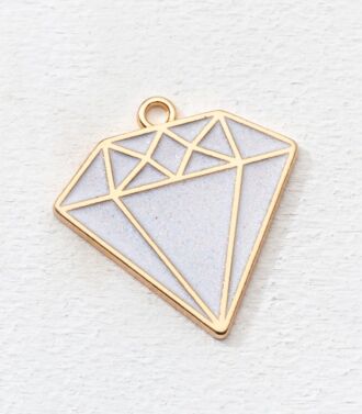 Μεταλλικό κρεμαστό διακοσμητικό διαμάντι σε χρυσό χρώμα με σμάλτο λευκό. Κατάλληλο για διακοσμήσεις και χειροποίητες κατασκευές. Η συσκευασία περιέχει 10 τεμάχια. Διάσταση: 3.5cm x 0.15 x 3.5 cm Τρύπα 3mm