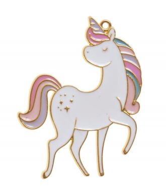 Μεταλλικό κρεμαστό μοτίφ μονόκερος σε πολύχρωμο σμάλτο. Κατάλληλο για διακοσμήσεις και χειροποίητες κατασκευές. Η συσκευασία περιέχει 10 τεμάχια. Διάστ.: 4×5 cm
