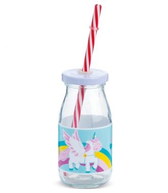 Γυάλινη κούπα διάφανη 300ml με χερούλι και λευκό μεταλλικό καπάκι. Συνοδεύεται από πολύχρωμα καλαμάκια. Είναι διακοσμημένη με αυτοκόλλητο print μονόκερος σε σιέλ-ροζ αποχρώσεις. Χωρητ.: 300ml Διάστ.: 7,5×7,5cm Ύψος 13cm Ελάχιστος χρόνος αποστολής: 8-10 εργάσιμες ημέρες.