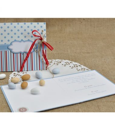Προσκλητήριο Βάπτισης Πουά-Ριγέ σε ματ χαρτί οπαλίνας 300γρ Διάσταση ανοιχτό 15x30cm , διάσταση κλειστο 15x15cm Το προσκλητήριο περιλαμβάνει δύο εκτυπώσεις, μία εσωτερική και μία εξωτερική. Στην τιμή περιλαμβάνονται τα έξοδα εκτύπωσης. Η συναρμολόγηση γίνεται από εσάς ή κατόπιν συνεννόησης Οι κορδέλες είναι έξτρα. Συμπληρώστε τα κείμενα που θέλετε να εμφανίζονται