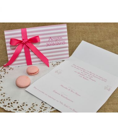 Προσκλητήριο Βάπτισης Τριπτυχο Ριγέ Ροζ σε ματ χαρτί οπαλίνας 300γρ Διάσταση ανοιχτό 20×29,5cm , διάσταση κλειστο 20x12cm Το προσκλητήριο περιλαμβάνει δύο εκτυπώσεις, μία εσωτερική και μία εξωτερική. Στην τιμή περιλαμβάνονται τα έξοδα εκτύπωσης. Η συναρμολόγηση γίνεται από εσάς ή κατόπιν συνεννόησης. Συμπληρώστε τα κείμενα που θέλετε να εμφανίζονται στο προσκλητήριο.