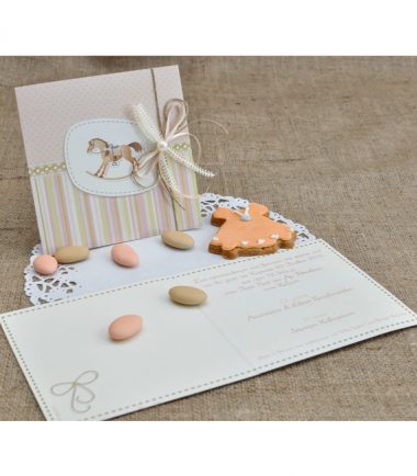 Προσκλητήριο Βάπτισης Πουά-Ριγέ Αλογάκι Με Εκτύπωση