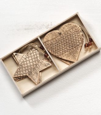 Ξύλινα κρεμαστά διακοσμητικά. Σε 2 σχήματα, αστέρι & καρδιά. Σε αποχρώσεις gold-bronze. Κάθε συσκευασία περιέχει 6 τεμάχια. Αστέρι: 7.3 x 7.1cm Καρδιά: 7 x 7cm