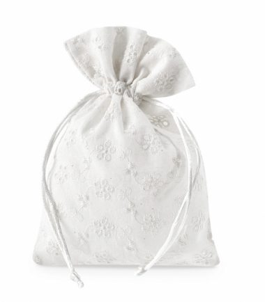 Υφασμάτινο πουγκί.Κλασσικό σχέδιο με ….”βελονάκι”…! Embroidery σε λευκό χρώμα. 12 x 18cm Εκεί που σουρώνει: 14cm