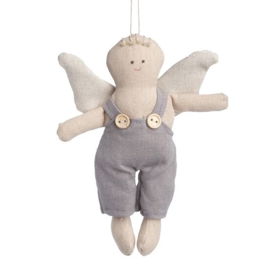 Υφασμάτινο κρεμαστό αγγελάκι αγόρι. Ντυμένο με γκρι σαλοπέτα.
