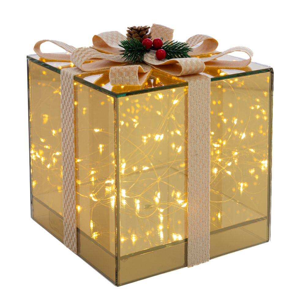 ΧΡΥΣΟ ΓΥΑΛΙΝΟ ΚΟΥΤΙ ΣΕ ΣΧΗΜΑ ΔΩΡΟΥ ΜΕ ΚΟΡΔΕΛΑ ΚΑΙ LED ΦΩΣ ΜΠΑΤΑΡΙΑΣ 18Χ18Χ18ΕΚ