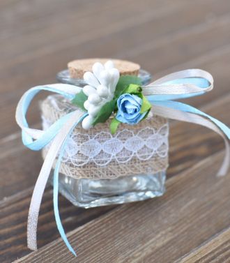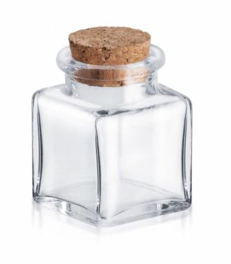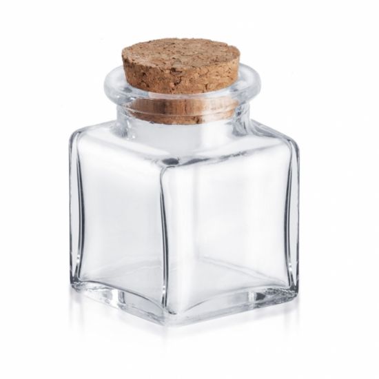 Γυάλινο τετράγωνο βαζάκι χαμηλό με κούμπωμα από φελλό. Περιεκτικότητα: 50ml.