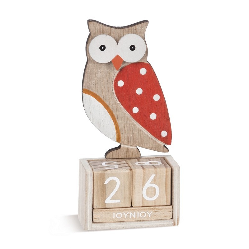 Ξύλινο διακοσμητικό ημερολόγιο με κύβους σε natural χρώο πάνω μέρος είναι διακοσμημένο με ξύλινη παράσταση κουκουβάγια σε κόκκινο πουά χρώμα.