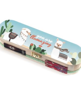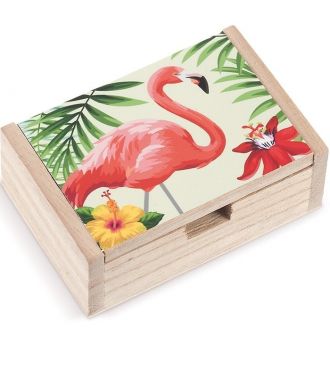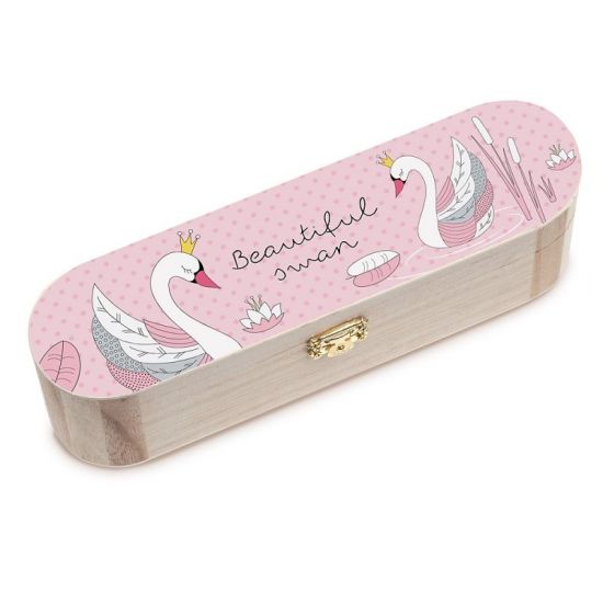 Ξύλινη natural κασετίνα με μεταλλικό κούμπωμα. Είναι διακοσμημένη με αυτοκόλλητο print κύκνος.