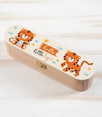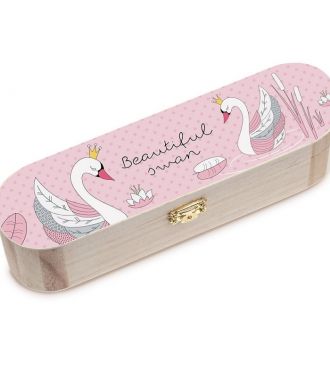 Ξύλινη natural κασετίνα με μεταλλικό κούμπωμα. Είναι διακοσμημένη με αυτοκόλλητο print μονόκερος σε σιέλ-ροζ αποχρώσεις.