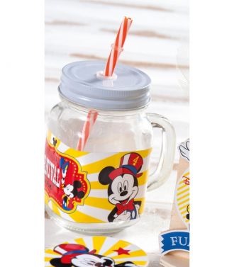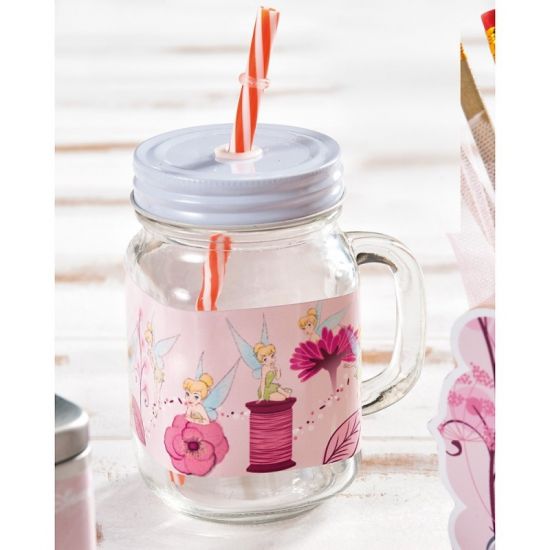 Disney γυάλινη κούπα διάφανη 300ml με χερούλι και λευκό μεταλλικό καπάκι. Συνοδεύεται από πολύχρωμα καλαμάκια. Είναι διακοσμημένη με αυτοκόλλητο print Tinkerbell flowers σε ροζ αποχρώσεις.