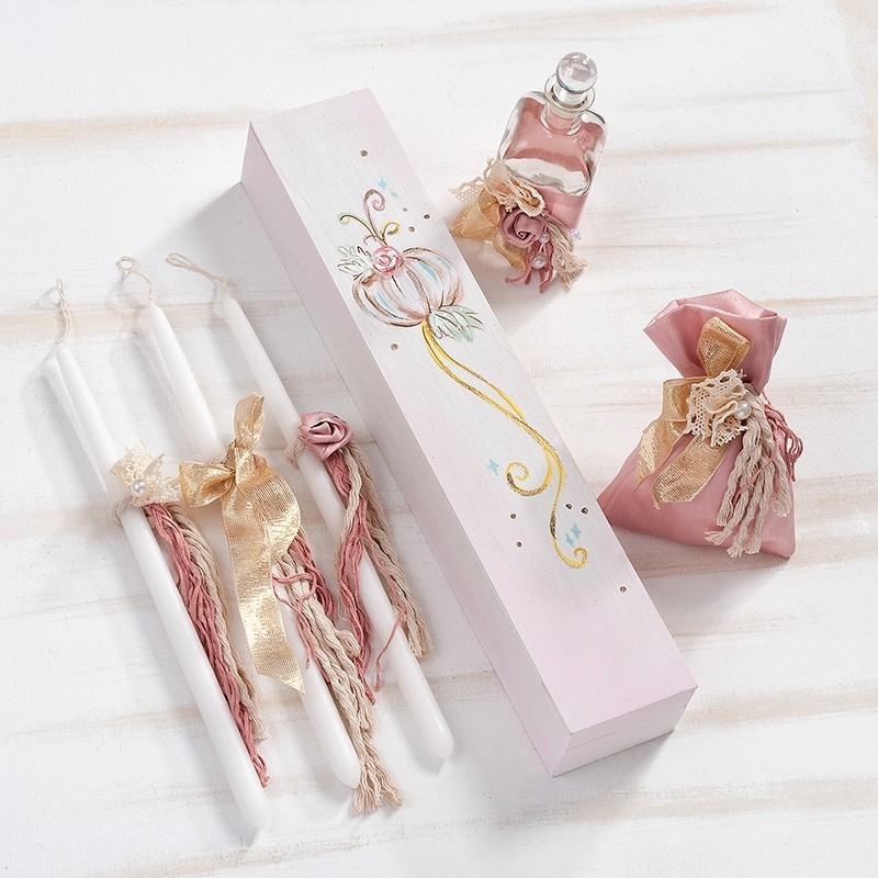 Ξύλινο κουτί συσκευασίας παραλληλόγραμμο ζωγραφισμένο στο χέρι με θέμα την πριγκιπική άμαξα.Ο κωδικός περιλαμβάνει τα 3 κεράκια,το σαπούνι μέσα σε πουγκάκι και το μπουκάλι του λαδιού,όλα στολισμένα σε χρυσές-μπεζ-ροζ-σάπιο μήλο αποχρώσεις.