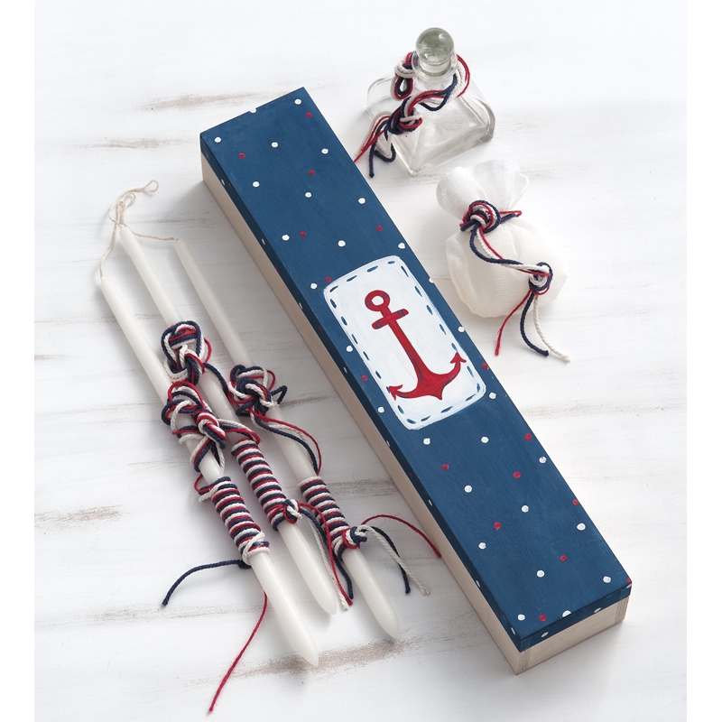 Ξύλινο κουτί συσκευασίας παραλληλόγραμμο ζωγραφισμένο στο χέρι με άγκυρα κόκκινη πάνω σε φόντο μπλε με πουά άσπρα και κόκκινα.Ο κωδικός περιλαμβάνει τα 3 κεράκια,το σαπούνι μέσα σε πουγκάκι και το μπουκάλι του λαδιού,όλα στολισμένα σε λευκές-κόκκινες-μπλε αποχρώσεις.
