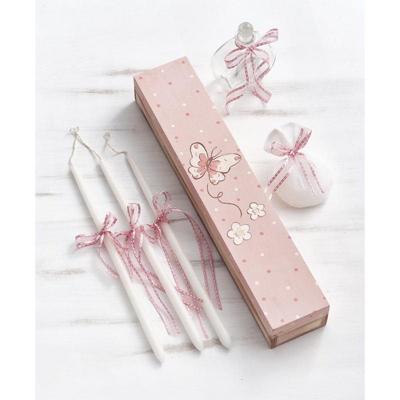 Ξύλινο κουτί συσκευασίας παραλληλόγραμμο ζωγραφισμένο στο χέρι με πεταλουδίτσα και λουλουδάκια σε φόντο ροζ με πουά λευκά και ροζ.Ο κωδικός περιλαμβάνει τα 3 κεράκια,το σαπούνι μέσα σε πουγκάκι και το μπουκάλι του λαδιού,όλα στολισμένα σε ροζ αποχρώσεις.