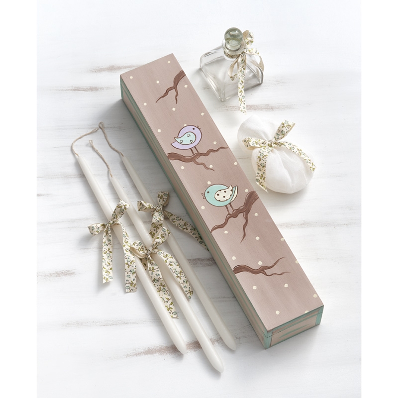 Ξύλινο κουτί συσκευασίας παραλληλόγραμμο ζωγραφισμένο στο χέρι με πουλάκια που τιτιβίζουν πανω σε κλαδιά δέντρου, σε χρώμα λιλά-βεραμάν πάνω σε φόντο πουά καφέ-εκρού.Ο κωδικός περιλαμβάνει τα 3 κεράκια,το σαπούνι μέσα σε πουγκάκι και το μπουκάλι του λαδιού,όλα στολισμένα με floral κορδέλα