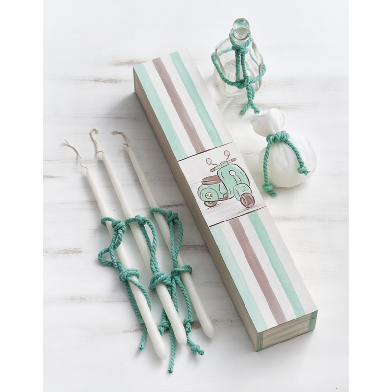 Ξύλινο κουτί συσκευασίας παραλληλόγραμμο ζωγραφισμένο στο χέρι με βέσπα σε χρώμα βεραμάν πάνω σε φόντο ριγέ βεραμάν-λευκό-καφέ.Ο κωδικός περιλαμβάνει τα 3 κεράκια,το σαπούνι μέσα σε πουγκάκι και το μπουκάλι του λαδιού,όλα στολισμένα σε βεραμάν αποχρώσεις