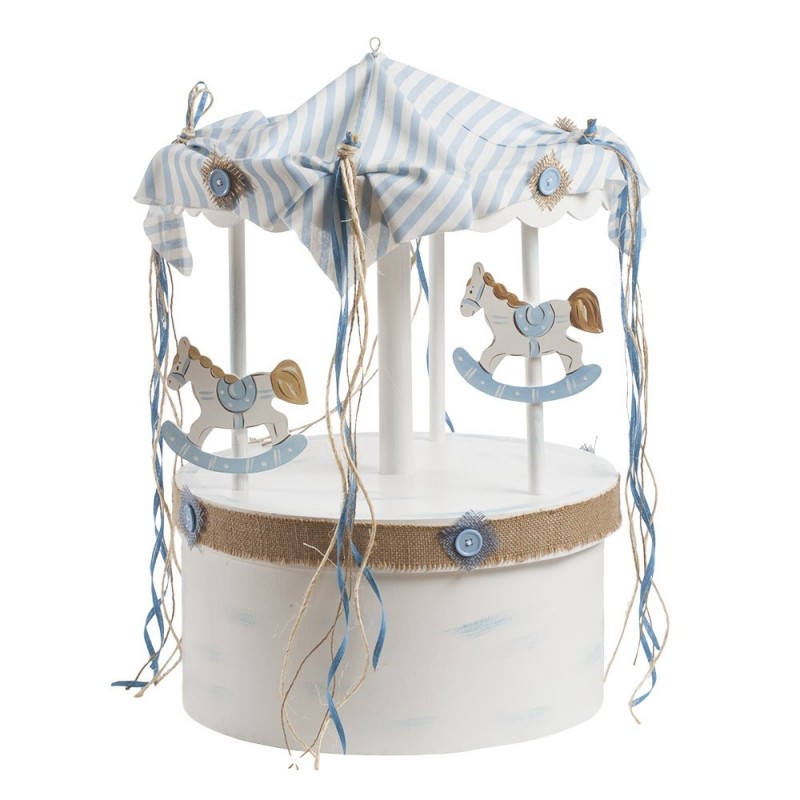 Ξύλινο λευκό καρουζέλ, συσκευασία βάπτισης στολισμένη με ύφασμα ριγέ σιέλ, λινάτσα και αλογάκια ξύλινα σιέλ και διακοσμημένη με κορδόνια,κορδέλες και κουμπιά σε καφέ-σιέλ αποχρώσεις. Όλο το κουτί έχει γύρω γύρω και σβησίματα σιέλ