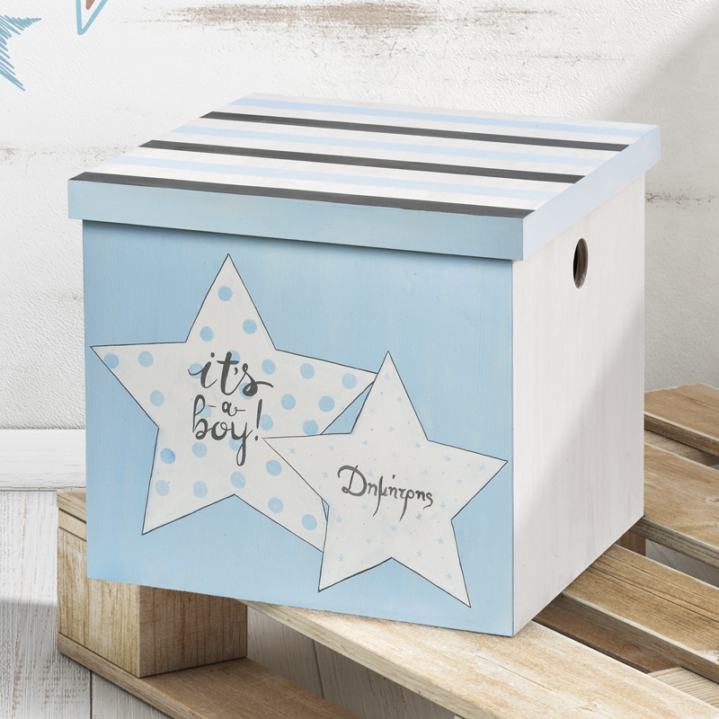 Ξύλινος natural κύβος,συσκευασία βάπτισης ζωγραφισμένη στο χέρι στο μπροστινό τμήμα του κουτιού με αστέρια πουά σιέλ πάνω σε φόντο σιέλ και μέσα στα οποία αναγράφεται η φράση “it’s a boy” στο ένα και “το όνομα ” του παιδιού που βαπτίζεται στο άλλο.Το καπάκι του κουτιού είναι βαμμένο σιέλ και από πάνω έχει ρίγες σε αποχρώσεις γκρι-λευκές-σιέλ