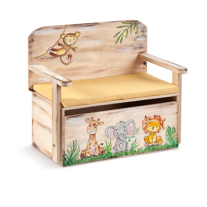 Ξύλινο κουτί βαπτιστικών παγκάκι που γίνεται θρανίο. Η ζούγκλα μας καλεί να την εξερευνήσουμε. Οι αποχρώσεις στο φόντο είναι brush natural και στην θέση του καθίσματος υπάρχει μαξιλάρι ντυμένο με κίτρινο βαμβακερό ύφασμα. Στο μπροστινό μέρος είναι ζωγραφισμένα τα εξής baby ζωάκια: λιοντάρι, ελέφαντας, και καμηλοπάρδαλη. Στην πλάτη βλέπουμε μια μαϊμουδίτσα με την μπανάνα της και στο τραπέζι του θρανίου μια μικρή ζέβρα.