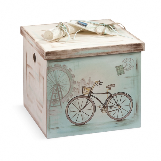 Ξύλινος natural κύβος με καπάκι, συσκευασία βάπτισης ζωγραφισμένη στο χέρι με θέμα το ποδήλατο σε καφέ χρώμα πάνω σε φόντο βεραμάν με γραμματόσημο.Το καπάκι του κουτιού διακοσμεί λινάτσα λευκή σε στυλ πάπυρου με γραμματόσημο και κορδέλες βεραμάν-εκρού ενώ όλο το κουτί έχει σβησίματα σε καφέ-βεραμάν αποχρώσεις