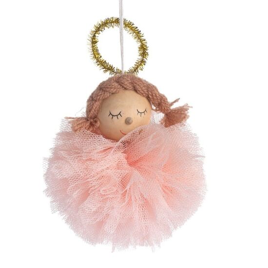 Ξύλινο κρεμαστό κοριτσάκι-άγγελος με ξύλινο κεφαλάκι και τούλινο pompom σε σομόν χρώμα