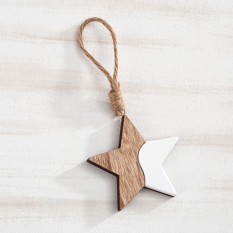 Κρεμαστό διακοσμητικό αστέρι σε σύνθεση από ξύλο σε φυσικό χρώμα και λευκή λάκα. Κατάλληλο και για κατασκευές.