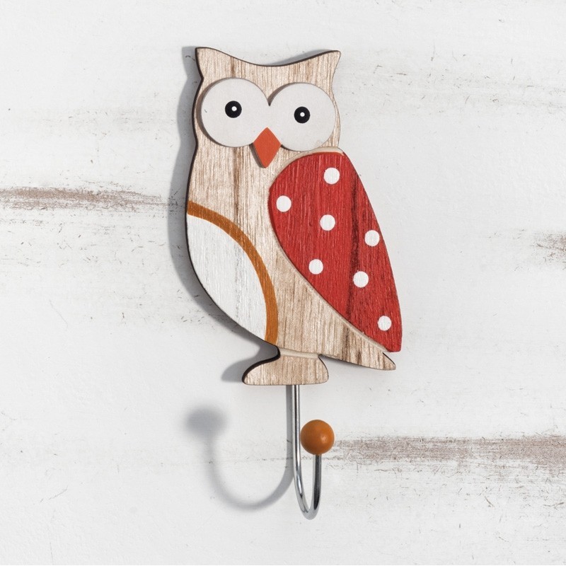 Ξύλινη κρεμάστρα τοίχου. Κουκουβάγια σε κόκκινο πουά χρώμα.