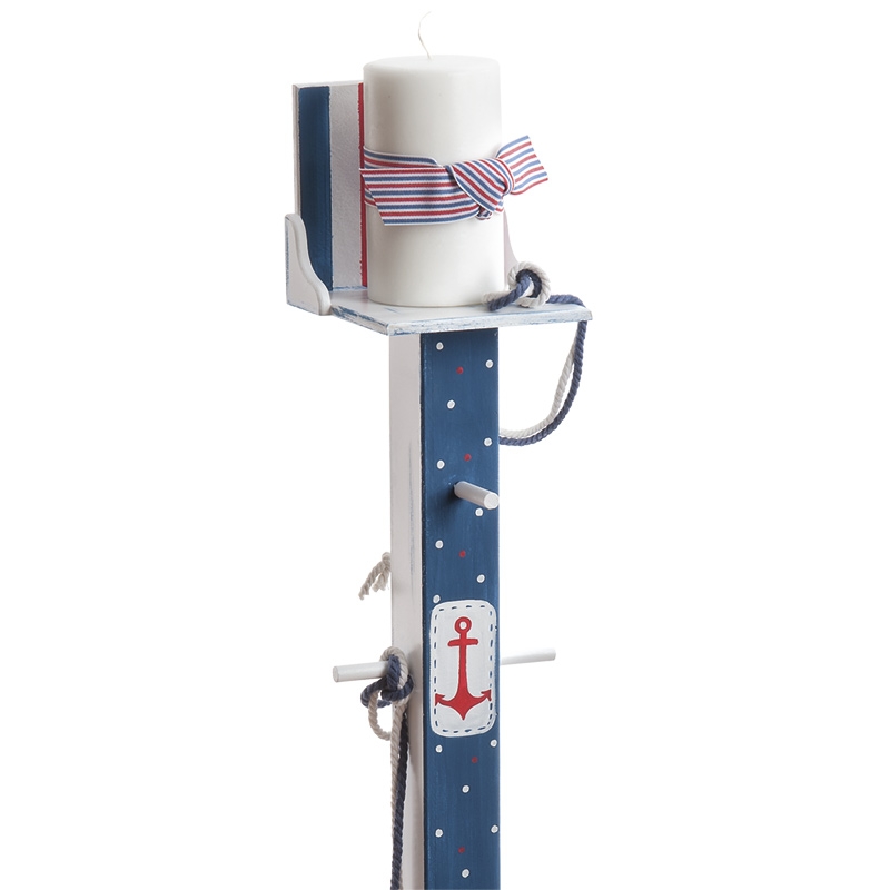 Ξύλινος λευκός κηροστάτης-κρεμάστρα,ζωγραφισμένος στο χέρι σε μπλε-κόκκινες-λευκές αποχρώσεις με άγκυρα κόκκινη και διακοσμημένος με κορδόνι λευκό-μπλε.Στην τιμή περιλαμβάνεται και το κερί για την εκκλησία.