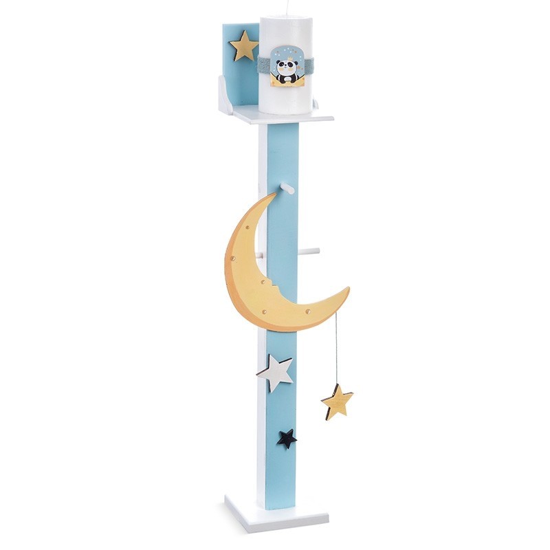 Ξύλινος λευκός κηροστάτης-κρεμάστρα,ζωγραφισμένος στο χέρι σε αποχρώσεις σιέλ-κίτρινες.Μπροστά είναι διακοσμημένος με ξύλινα αστεράκια και ξύλινο μεγάλο κίτρινο φεγγάρι από το οποίο κρέμεται ξύλινο κίτρινο αστεράκι,ενώ το πάνω μέρος του κηροστάτη διακοσμείται επίσης με ξύλινα αστεράκια.Στην τιμή περιλαμβάνεται και το κερί για την εκκλησία.
