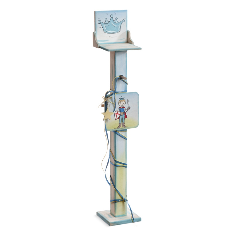 Ξύλινος λευκός κηροστάτης-κρεμάστρα,ζωγραφισμένος στο χέρι σε σιέλ-λαχανί αποχρώσεις.Η πλάτη του κηροστάτη είναι ζωγραφισμένη με κορώνα σιέλ και το μπροστινό τμήμα του κηροστάτη διακοσμεί ξύλινο καδράκι με πρίγκιπα.Στην τιμή περιλαμβάνεται και το κερί για την εκκλησία.
